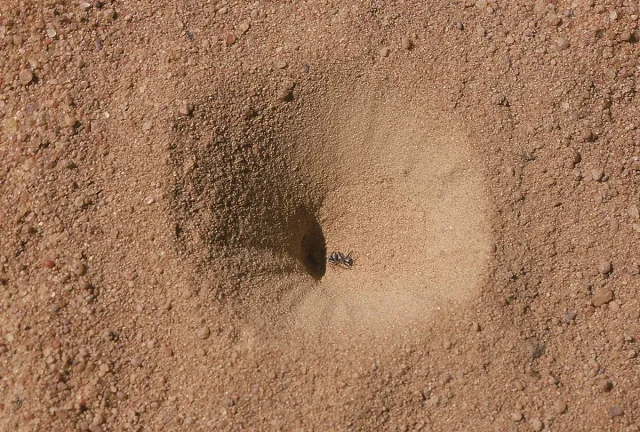 Once an insect slips into the pit, it struggles to climb out. Each movement causes the sand to slide back down. From the bottom, hidden beneath the sand, the sand lion throws tiny showers of sand upward. This makes the slope collapse further and pulls the prey toward its waiting jaws.